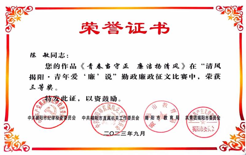 陳敏同志榮獲“清風(fēng)揭陽·青年愛‘廉’說”勤政廉政征文比賽三等獎