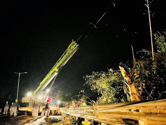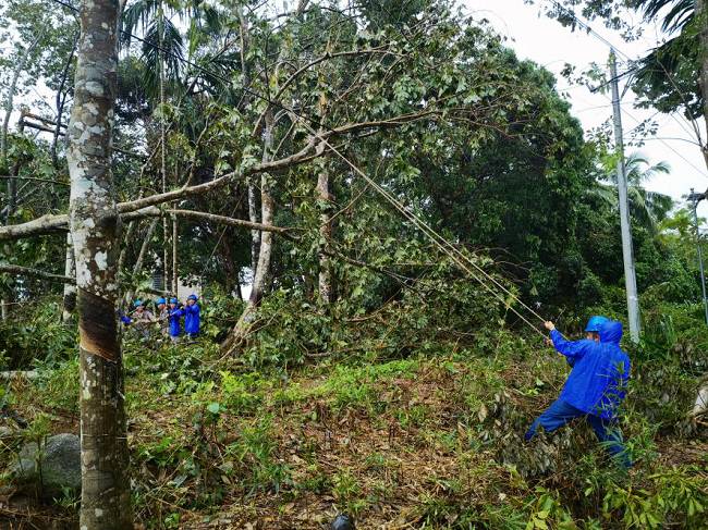 到達海南后,揭陽明利綜合能源發(fā)展有限公司支援海南抗災(zāi)搶險隊在澄邁縣緊鑼密鼓開展搶修復(fù)電工作。澄邁地貌相對平整,但林區(qū)覆蓋率較高,橡膠林香蕉園廣泛分布,臺風摩羯過境后,林區(qū)樹木倒塌壓垮電線,線路損壞嚴重。為打通線路搶修通道,加快復(fù)電進度,公司搶險隊伍一邊組織大型施工機械快速重新組立電桿,一邊組織人員及時消缺搶修,力爭以最快速度恢復(fù)線路正常供電。